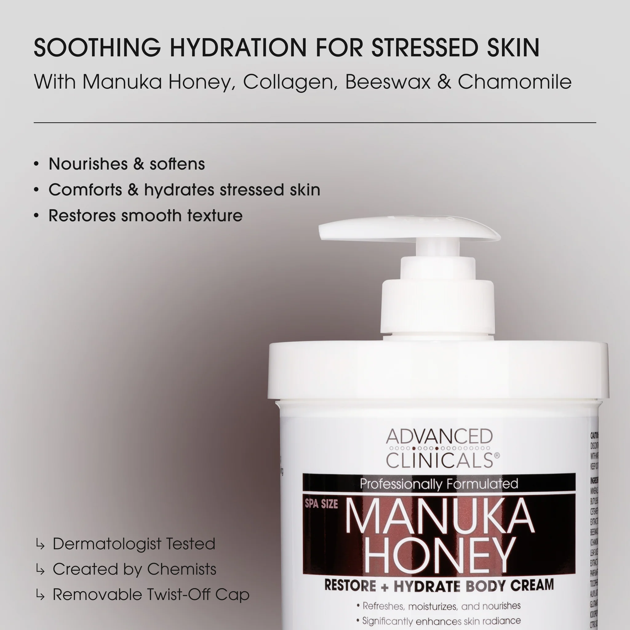 كريم الجسم هذا بخلاصة عسل مانوكا، غني بالكولاجين وشمع العسل وخلاصة البابونج، يغذي ويلطف البشرة شديدة الجفاف والمتضررة، مما يساعد على استعادة نعومتها ومنحها شعورًا بالراحة والانتعاش. يذوب هذا الكريم الغني المخملي على البشرة ليرطبها ويعيد إليها نعومتها.