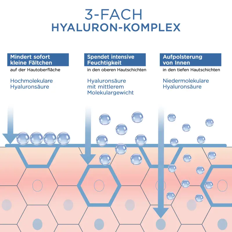 حمض الهيالورونيك ذو الوزن الجزيئي المتوسط: يُشكّل طبقة واقية ومرطبة تدوم طويلاً، وينظم محتوى الماء في الخلايا.
