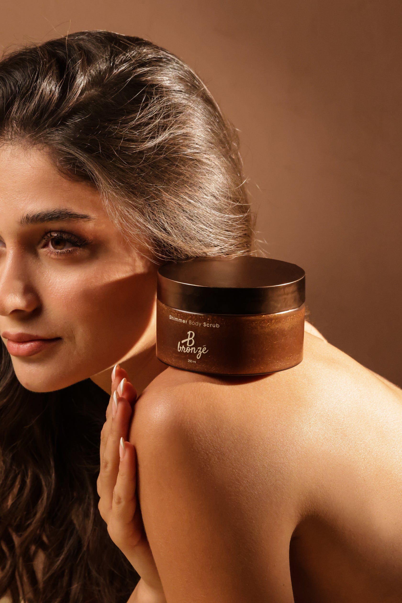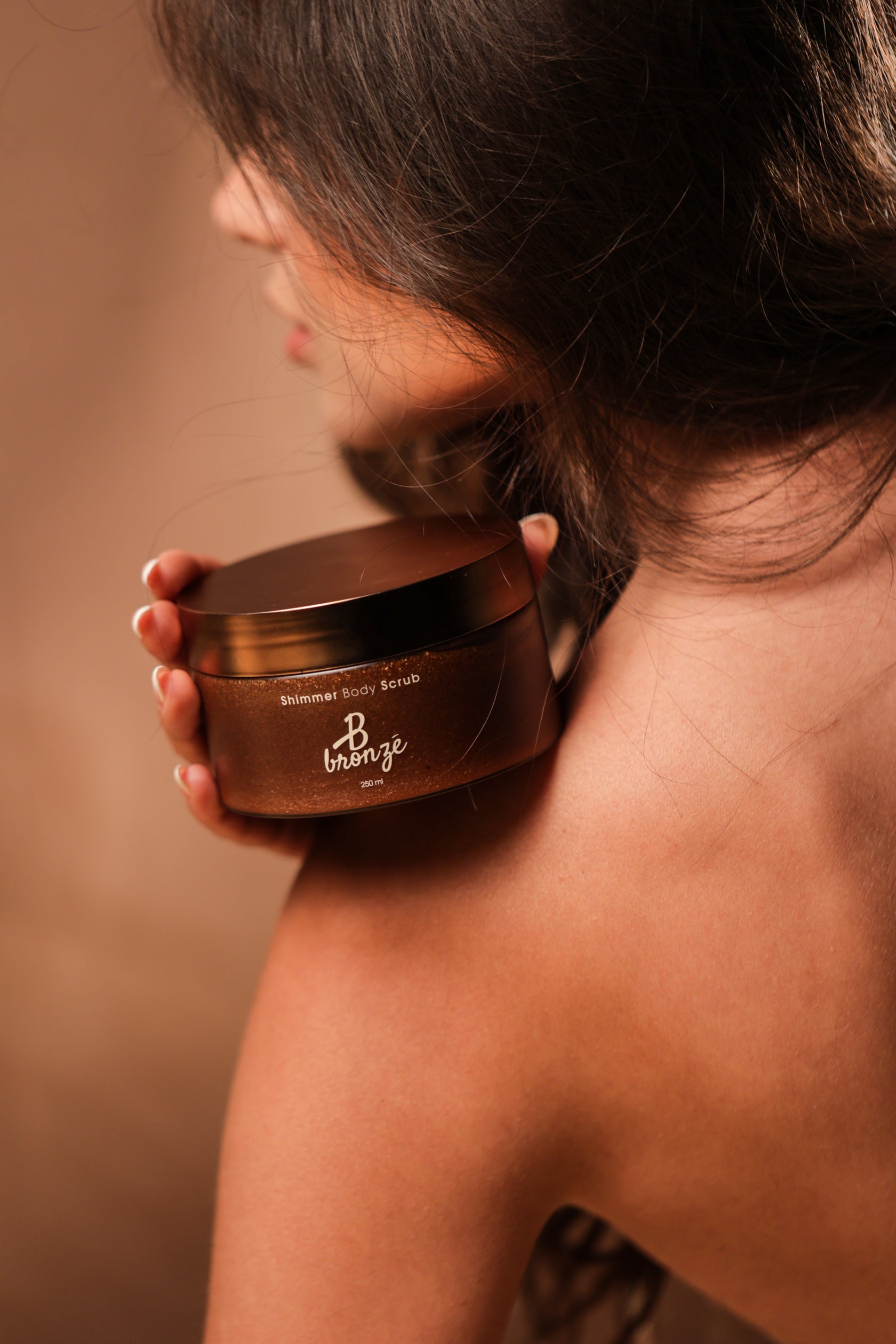 تُستخدم مقشرات الجسم اللامعة، مثل هذا المنتج، لتقشير البشرة، وإزالة خلايا الجلد الميتة والشوائب، مع إضفاء إشراقة برونزية لامعة كالشمس.