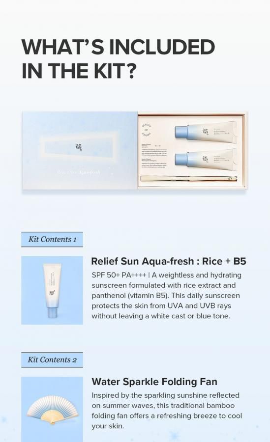 BEAUTY OF JOSEON RELIEF AQUA-FRESH RICE + B5 SET 50ml+50ml+fan مجموعة واقيات للحماية من الشمس من بيوتي اوف جوسين