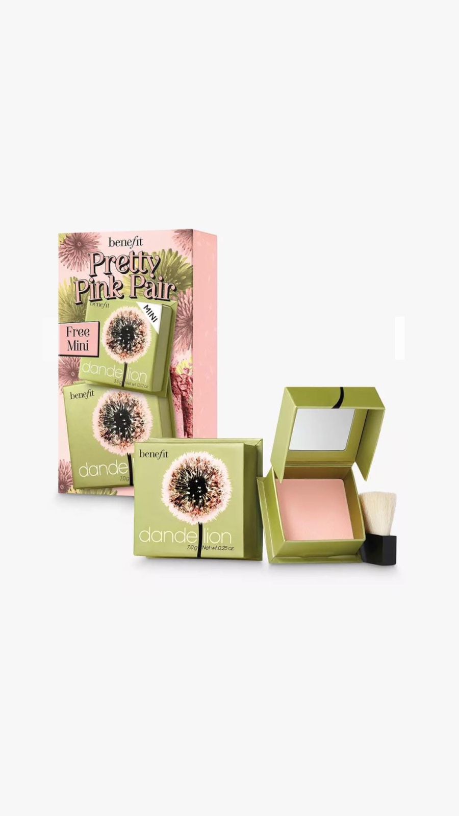 يشتمل هذا الزوج الجميل على Dandelion بالحجم الكامل والميني ، أحمر الخدود المشرق الوردي الفاتح من Benefit. تأتي كل علبة كاملة مع مرآة مدمجة وفرشاة بودرة لخدود حلوة أثناء التنقل!