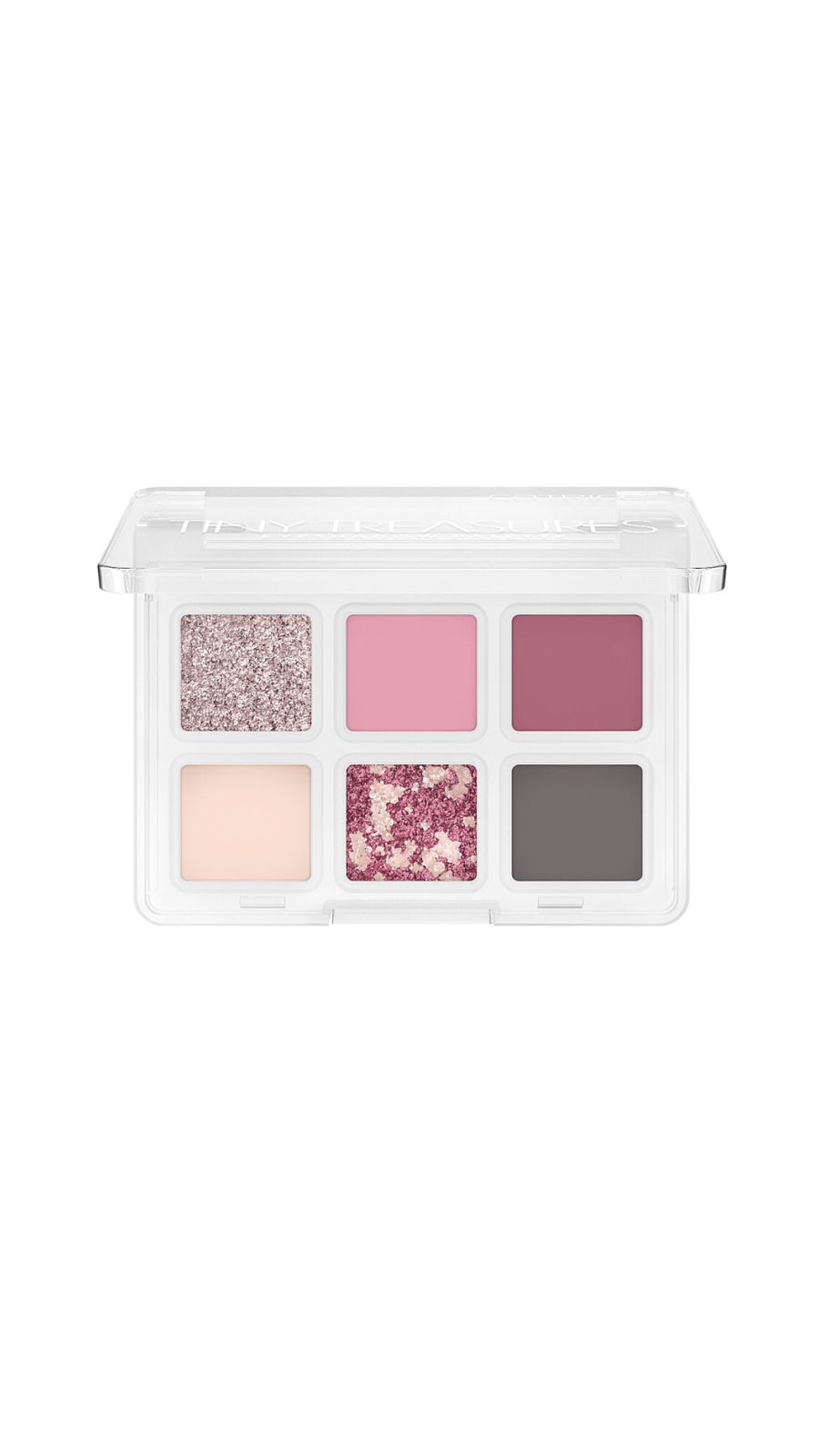 ظلال العيون من Catrice Tiny Treasures باليت مصغرة وعملية تجمع بين مجموعة متناسقة من درجات اللون الوردي والتوت والرمادي الألوان تحتوي الباليت على ستة ألوان تتنوع بين اللمسات النهائية المطفية Matte واللامعة Shimmering والمعدنية Metallic مما يتيح لكِ ابتكار إطلالات متنوعة من المكياج اليومي الناعم إلى إطلالات السهرات المميزة تتميز بتركيبة عالية الصبغة ناعمة وسهلة الدمج والتطبيق قابلية الحمل حجمها الصغير يجعلها مثالية للحمل في حقيبة اليد أو أثناء السفر .