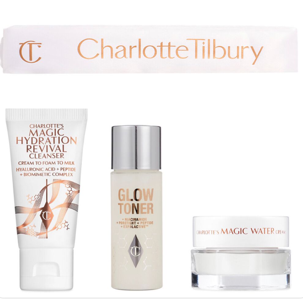 مجموعة متكاملة للعناية بالبشرة من CHARLOTTE TILBURY تتضمن هذه المجموعة غسول ماجيك هايدريشن ريفايفل المحبوب عالميًا، وتونر جلو، وكريم ماجيك ووتر الحائز على جوائز لتنظيف البشرة وتوحيد لونها وترطيبها، بالإضافة إلى ربطة رأس بيضاء مستوحاة من أجواء المنتجعات الصحية للاسترخاء التام