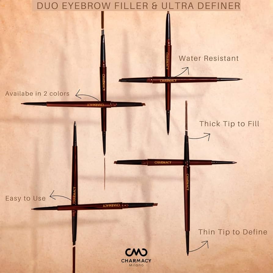 قلم تحديد الحواجب المزدوج من شارمسي ميلانو، فوائد 2 في 1، سهل الاستخدام، حواجب طبيعية، لمسة نهائية غير لامعة، مقاوم للتلطخ.