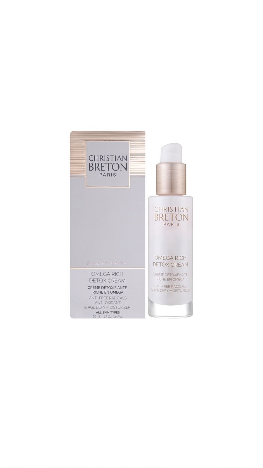 يستخدم كريم Christian Breton Paris Omega Rich Detox Cream لإزالة السموم من البشرة وترطيبها وحمايتها من علامات الشيخوخة المبكرة