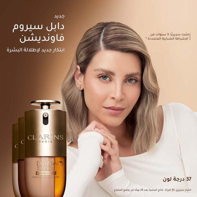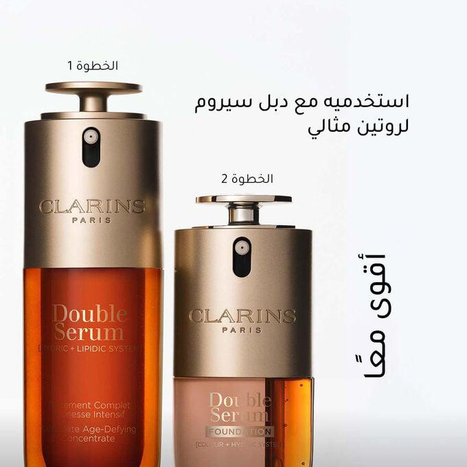 كريم أساس دبل سيروم Double Serum Foundation من Clarins يجمع بين فوائد العناية بالبشرة وتغطية المكياج تركيبة مزدوجة يعتمد على نظام COLOR + HYDRIC المستوحى من تقنية دبل سيروم الشهيرة حيث يمزج بين مرحلة اللون ومرحلة مائية للعناية بالبشرة يحتوي على 14 مكوناً نباتياً فعّالاً منها مستخلص الكركم لتعزيز حيوية البشرة، والباباين لتنعيم ملمسها وحمض الهيالورونيك للترطيب العميق حيث يوفر تغطية من متوسطة إلى كاملة بلمسة نهائية ساتانية مضيئة ويساعد على إخفاء العيوب مع الحفاظ على مظهر صحي وطبيعي يدوم اللون والراحة على البشرة لمدة تصل إلى 12 ساعة يعمل على تنشيط الوظائف الحيوية للبشرة مما يمنحها مظهراً أكثر شباباً وإشراقاً مع الاستخدام المستمر.