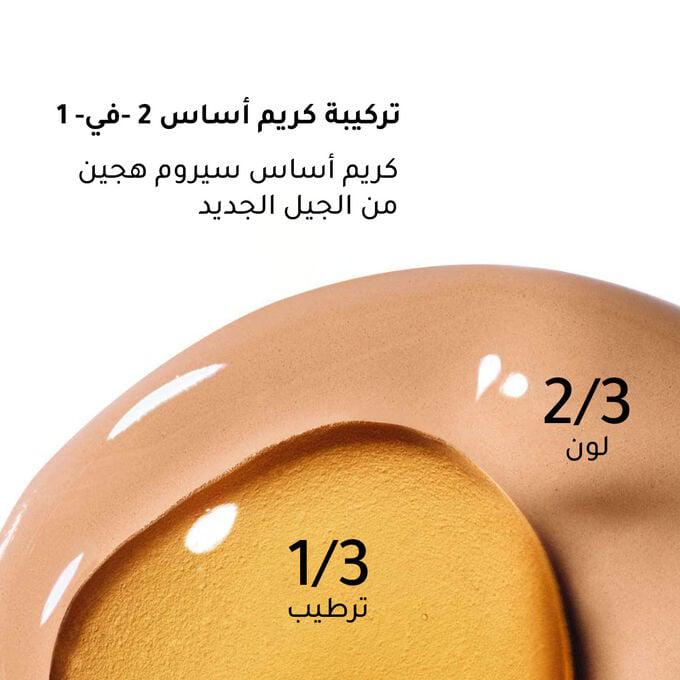 كريم أساس دبل سيروم من Clarins يجمع بين مزايا المكياج والعناية بالبشرة في آن واحد يعتمد على تقنية مزدوجة مستوحاة من دبل سيروم حيث يمزج بين مرحلة اللون ومرحلة مائية غنية بالمكونات النشطة للعناية بالبشرة حيث يحتوي على 14 مكوناً نباتياً فعالاً من أبرزها مستخلص الكركم لتعزيز حيوية البشرة وحمض الهيالورونيك للترطيب العميق بالإضافة الى يوفر تغطية متوسطة إلى كاملة مع لمسة نهائية “ساتانية” مضيئة تمنح البشرة إشراقاً طبيعياً وصحياً.