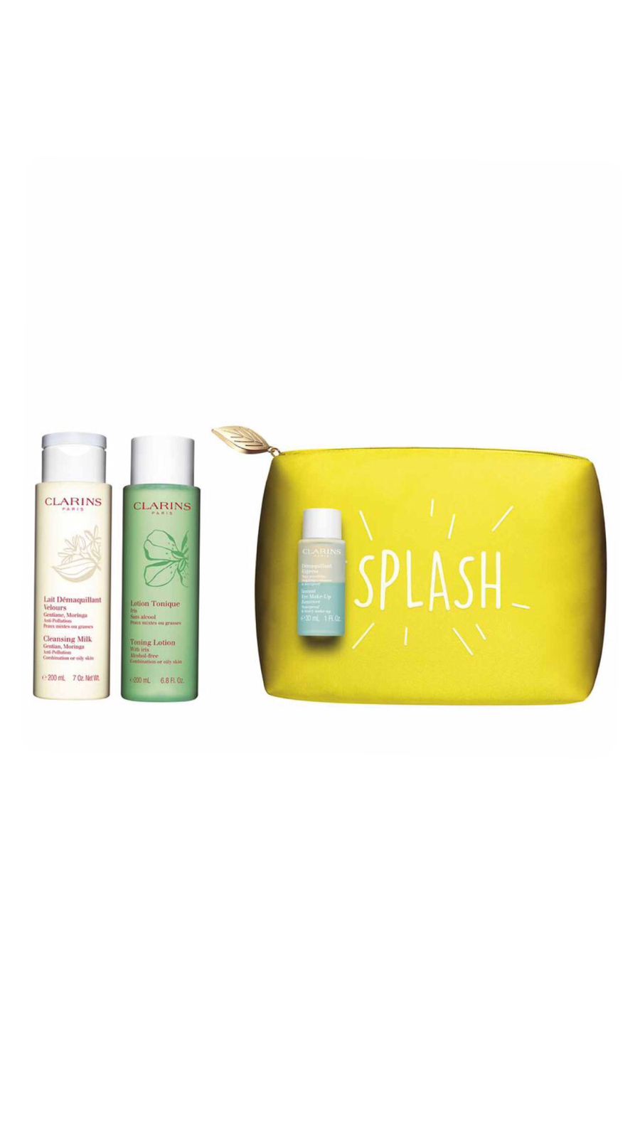 مجموعة متكاملة للعناية بالبشرة من CLARINS حيث تتكون من حليب منظف للبشرة ، لوشن (تونر) للبشرة ، بالاضافة الى مزيل لمكياج العيون .