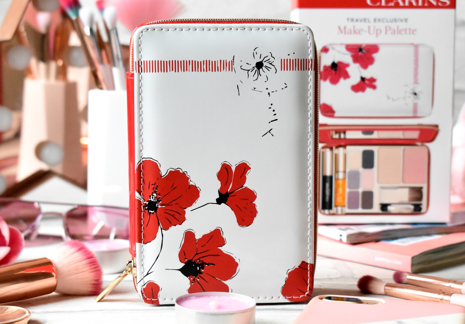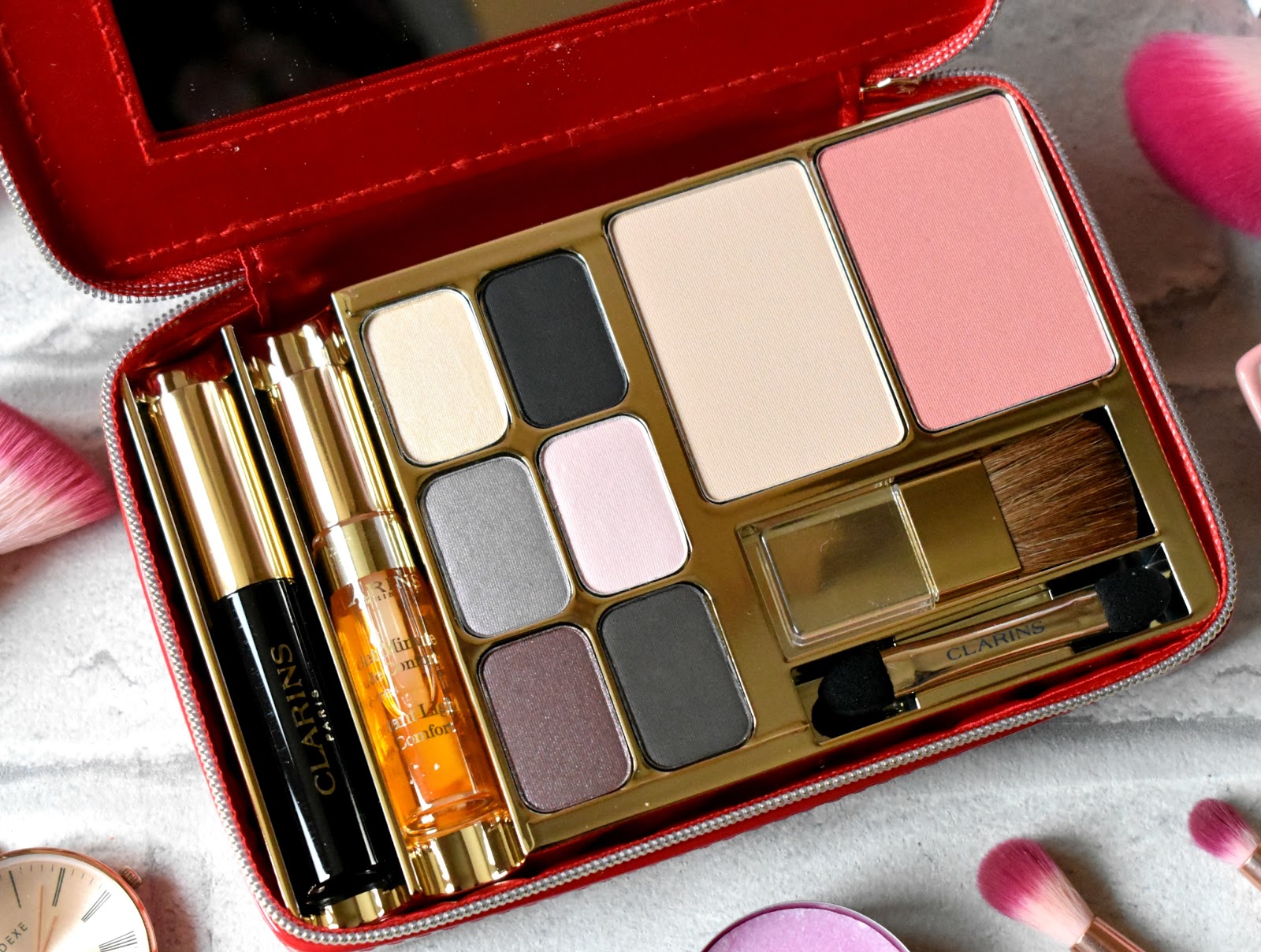 لوحة مكياج كلارنس للسفر تضم ماسكارا، زيت شفاه، 6 ظلال عيون، بودرة، أحمر خدود وفرش بعلبة أنيقة بسحاب.
