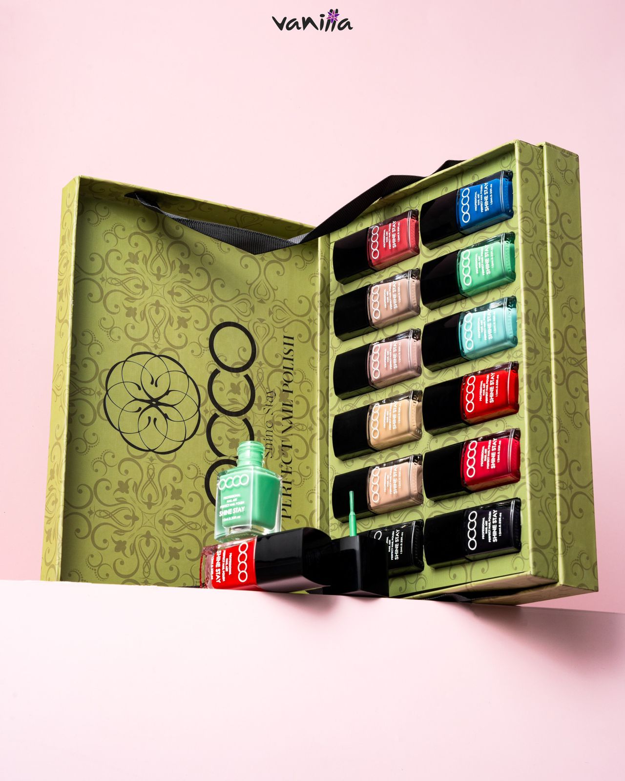 مجموعة هدايا من طلاء أظافر “شاين ستاي بيرفكت” من ماركة CCOO، تحتوي على زجاجات متعددة من طلاء الأظافر بألوان متنوعة.