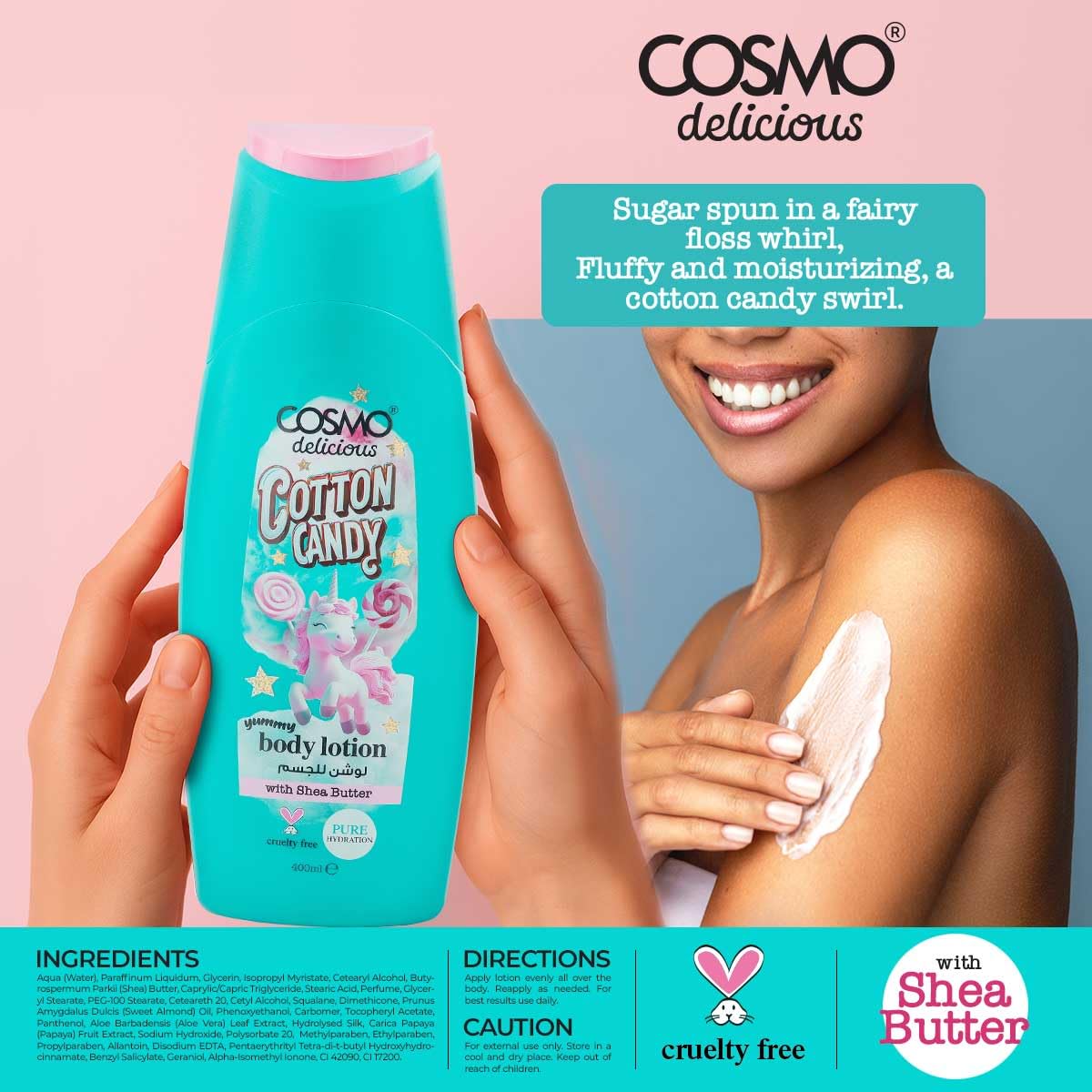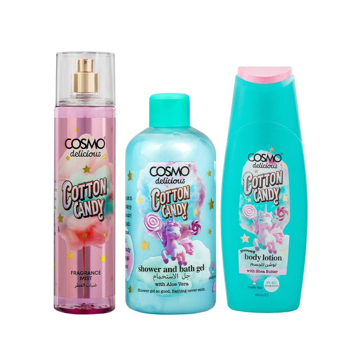 COSMO Delicious Cotton Candy 3 Pieces Gift Set For Women & Men (150ml +350ml +200ml ) كوزمو مجموعة العناية بالبشرة برائحة حلوى القطن