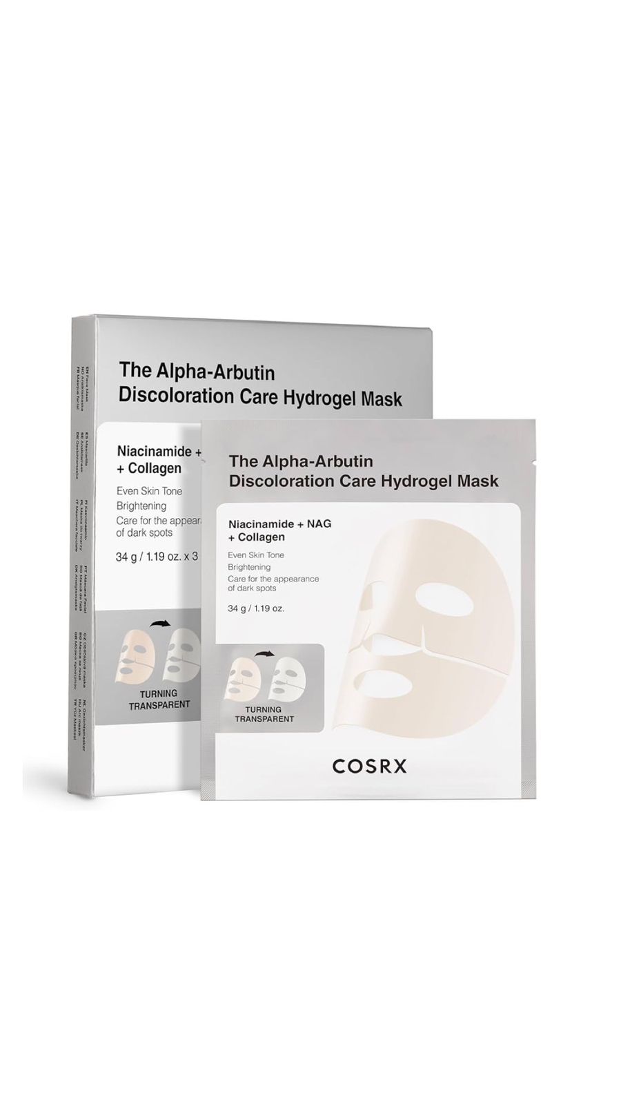 ماسك هيدروجيل الألفا أربوتين للعناية بالتصبغات (The Alpha-Arbutin Discoloration Care Hydrogel Mask) يعمل هذا الماسك بشكل أساسي على تفتيح البشرة تقليل البقع الداكنة وتوحيد لون البشرة المتفاوت بفضل تركيبته التي تجمع بين مكونات قوية وفعالة يحتوي الماسك على مزيج مبتكر يستهدف مشاكل التصبغ مع الحفاظ على ترطيب ونعومة البشرة ألفا أربوتين (Alpha-Arbutin) المكون الرئيسي الذي يساعد في تقليل مظهر البقع الداكنة وفرط التصبغ للحصول على بشرة أكثر إشراقاً النياسيناميد (Niacinamide) يعمل على تحسين ملمس البشرة وتعزيز حاجزها الطبيعي وتوحيد لونها الكولاجين منخفض الوزن الجزيئي يساعد في تحسين مرونة البشرة وجعلها تبدو أكثر امتلاءً ونعومة حمض الهيالورونيك والسيراميد لتوفير ترطيب عميق وتقوية حاجز الرطوبة في الجلد الجلوتاثيون وحمض الفيروليك مضادات أكسدة قوية تدعم نضارة البشرة وتعزز من مفعول التفتيح يتميز هذا الماسك بتقنية الهيدروجيل حيث يتحول القناع تدريجياً إلى شفاف مع امتصاصه للمكونات الفعالة مما يضمن توصيل المكونات بشكل عميق يلتصق القناع بالوجه بشكل وثيق ليشبه طبقة الجلد الثانية مما يجعله مريحاً عند الارتداء ويمنع تبخر السوائل.
