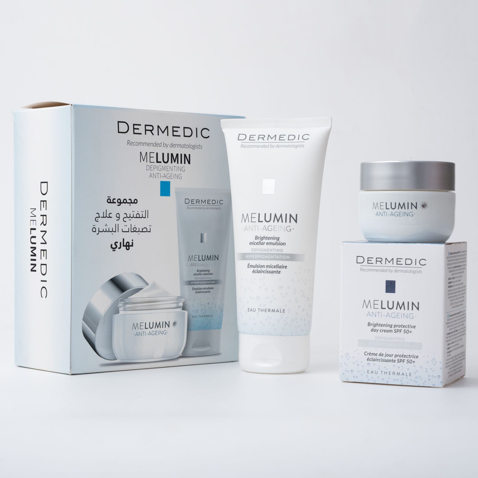 Dermedic melumin depigmrnting anti aging set مجموعة تفتيح وعلاج تصبغات البشرة النهاري