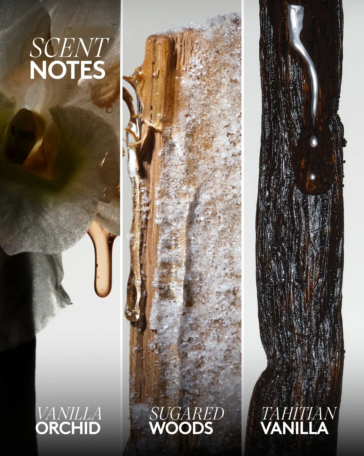 قاعدة العطر: فانيليا تاهيتي، أخشاب مُحلّاة، مسك ناعم