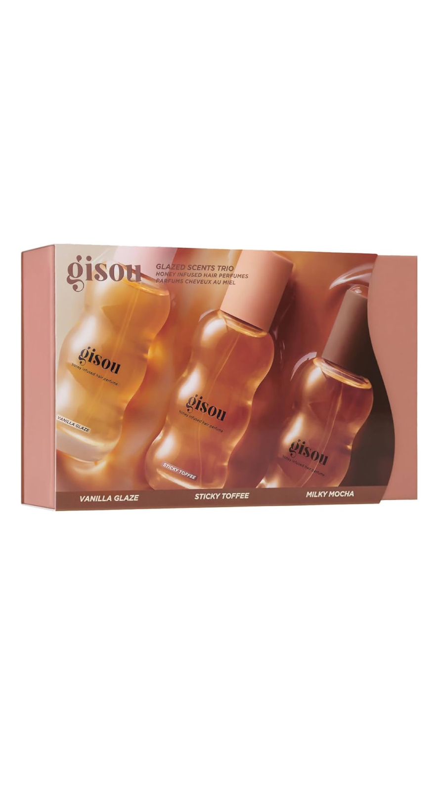 مجموعة Glazed Scents Trio من Gisou وهي مجموعة محدودة الإصدار تضم ثلاثة عطور للشعر بأحجام صغيرة عبوة تتميز هذه العطور بأنها مستوحاة من نكهات الحلويات الخريفية ومصممة لتعطير الشعر مع منحه لمعاناً وترطيباً.