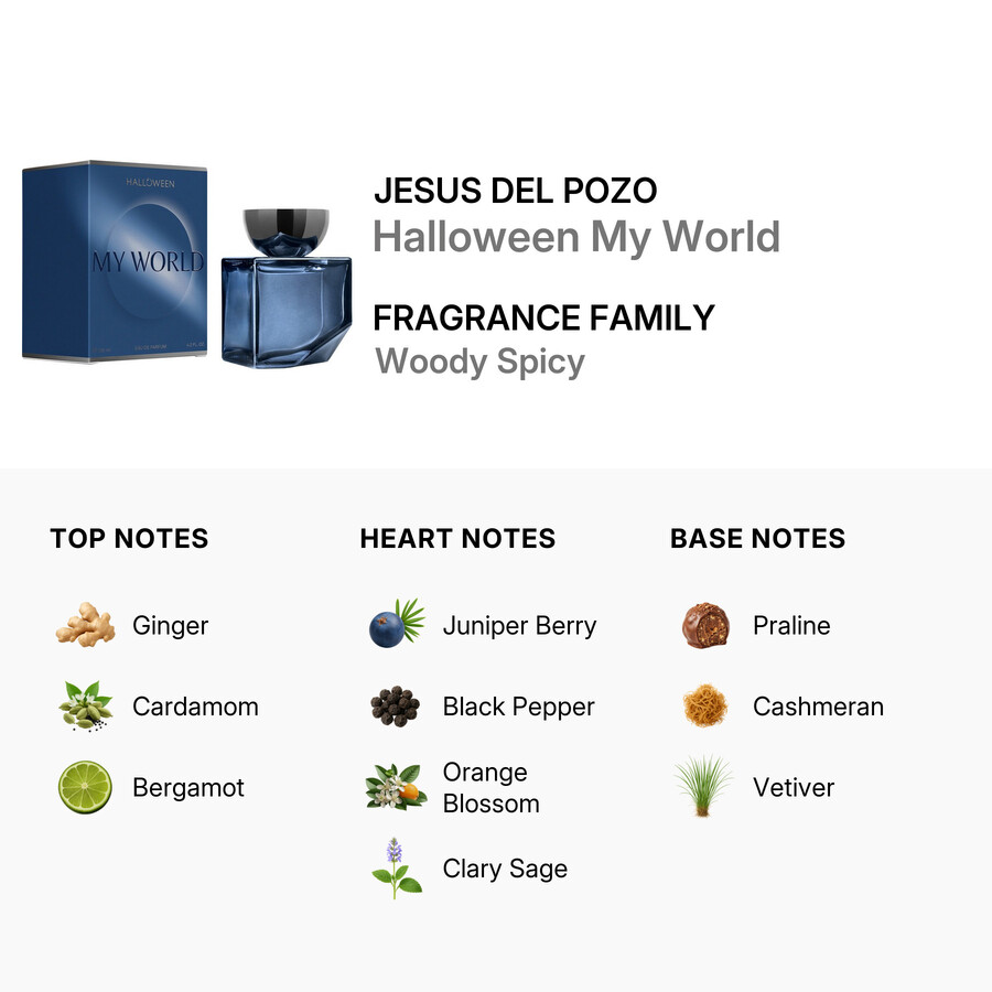 تستقر قاعدة هذا العطر الآسر على نفحات غنية من البرالين والكشميران ونجيل الهند. تمنح هذه النفحات الترابية العميقة لمسة نهائية تدوم طويلًا، تجمع بين الراحة والجاذبية. صُمم عطر “هالوين ماي وورلد” من قِبل دار الأزياء الإسبانية الشهيرة “خيسوس ديل بوزو”، وهو عطرٌ مميز للرجال الذين يُقدّرون الأناقة والروح والتفرد.