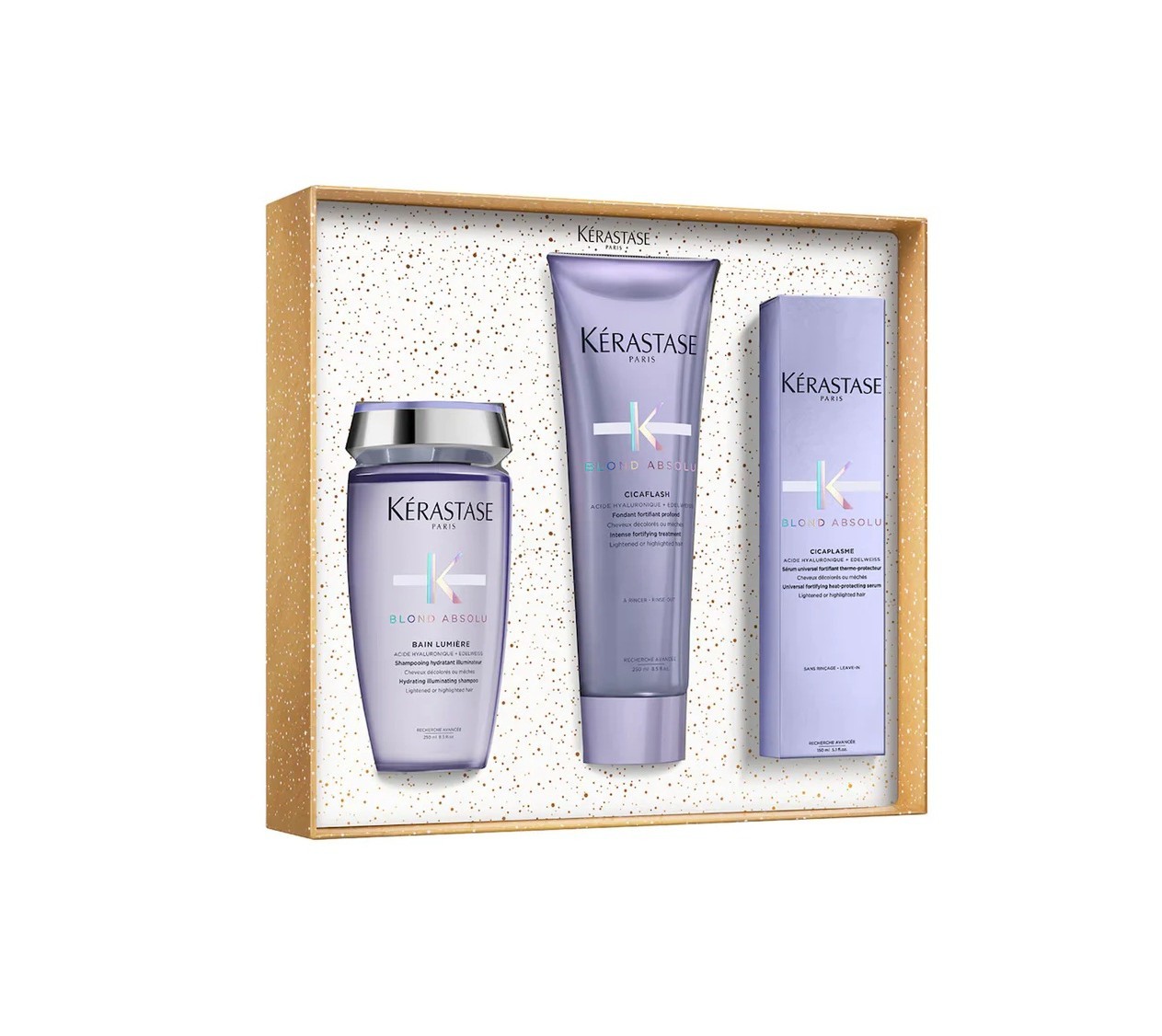 شامبو Bain Lumière (250 مل)، وبلسم Fondant Cicaflash (250 مل)، وسيروم Cicaplasme (150 مل). تشكل هذه المنتجات معًا روتينًا متكاملًا للعناية بالشعر، حيث تعمل على تنقية الشعر وإصلاحه وحمايته، لتمنحكِ لونًا أشقرًا مشرقًا وجذابًا.