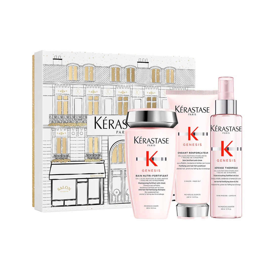مجموعة كيراستاس جينيسيس فوندان هوليداي تريو هي مجموعة عناية مُقوّية مُصممة خصيصًا للشعر الخفيف والهش المُعرّض للتقصف والتساقط. تُساعد هذه المجموعة، المُكوّنة من ثلاث خطوات، على تقوية ألياف الشعر، وتحسين مرونته، وحماية خصلاته من عوامل الإجهاد اليومية.