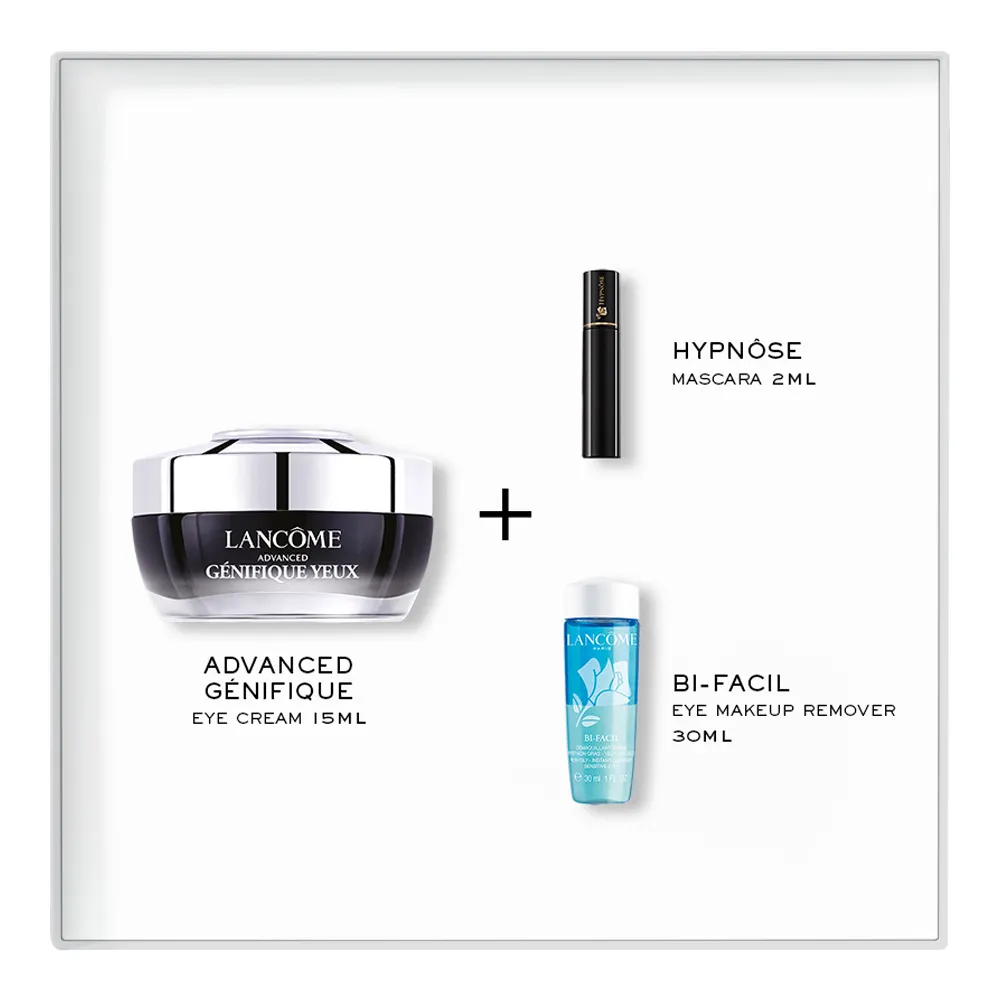 اكتشفي مجموعة رينيرجي للعينين من لانكوم: كريم يعيد شد وإشراقة محيط العين، ماسكارا هيبنوز لكثافة مثالية تدوم 24 ساعة، وباي-فاسيل لإزالة المكياج بلطف مساءً.