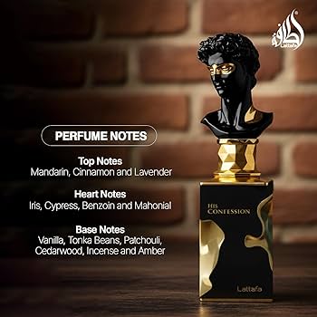 عطر “His Confession” من لطافة للعطور هو عطر شرقي خشبي للرجال. هذا عطر جديد، أُطلق عام ٢٠٢٤. تتكون مقدمة العطر من القرفة والخزامى واليوسفي؛ وقلبه من السوسن والجاوي والسرو والماهوجني؛ وقاعدته من الفانيليا والتونكا والعنبر والبخور وخشب الأرز والباتشولي.