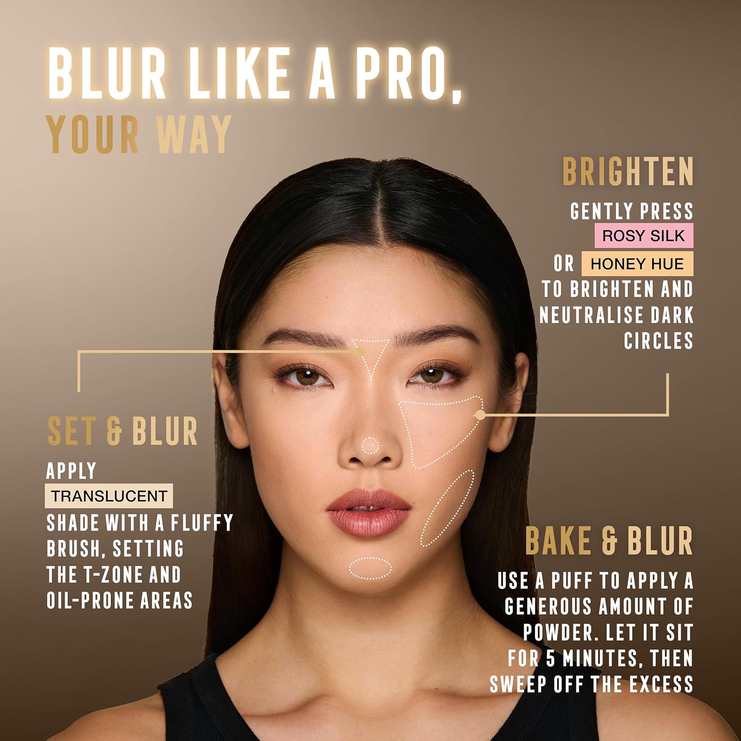 لإضفاء إشراقة، اضغطي برفق على لون “روزي سيلك” أو “هوني هيو” تحت العينين لتفتيح الهالات السوداء وتخفيفها.