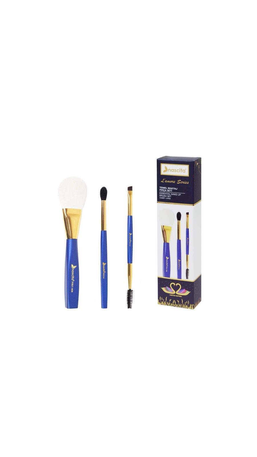 هي مجموعة أساسية من 3 قطع تشتمل على فرشاة أحمر خدود وبودرة وفرشاة لدمج ظلال العيون وفرشاة مزدوجة للايلاينر والماسكارا
