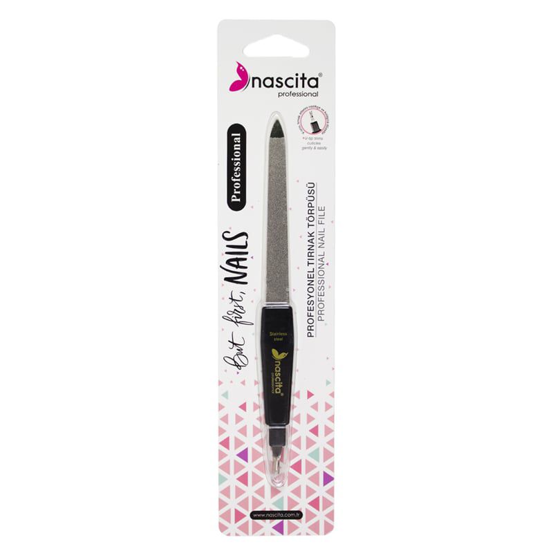 مبرد أظافر احترافي من Nascita وهو مصمم للعناية الشخصية بالأظافر مصنوع من الفولاذ المقاوم للصدأ (Stainless Steel) مما يجعله متيناً ويدوم طويلاً مقارنة بالمبارد الورقية يتميز بمقبض بلاستيكي مريح ليسهل التحكم به أثناء مبرد سفاير (Sapphire) أو معدني مزدوج الوجه حيث يحتوي عادةً على جهة خشنة لتشكيل الظفر وجهة أنعم للتنعيم النهائي مثالي لتشكيل حواف الأظافر الطبيعية أو الصناعية وتنعيمها دون التسبب في تكسره