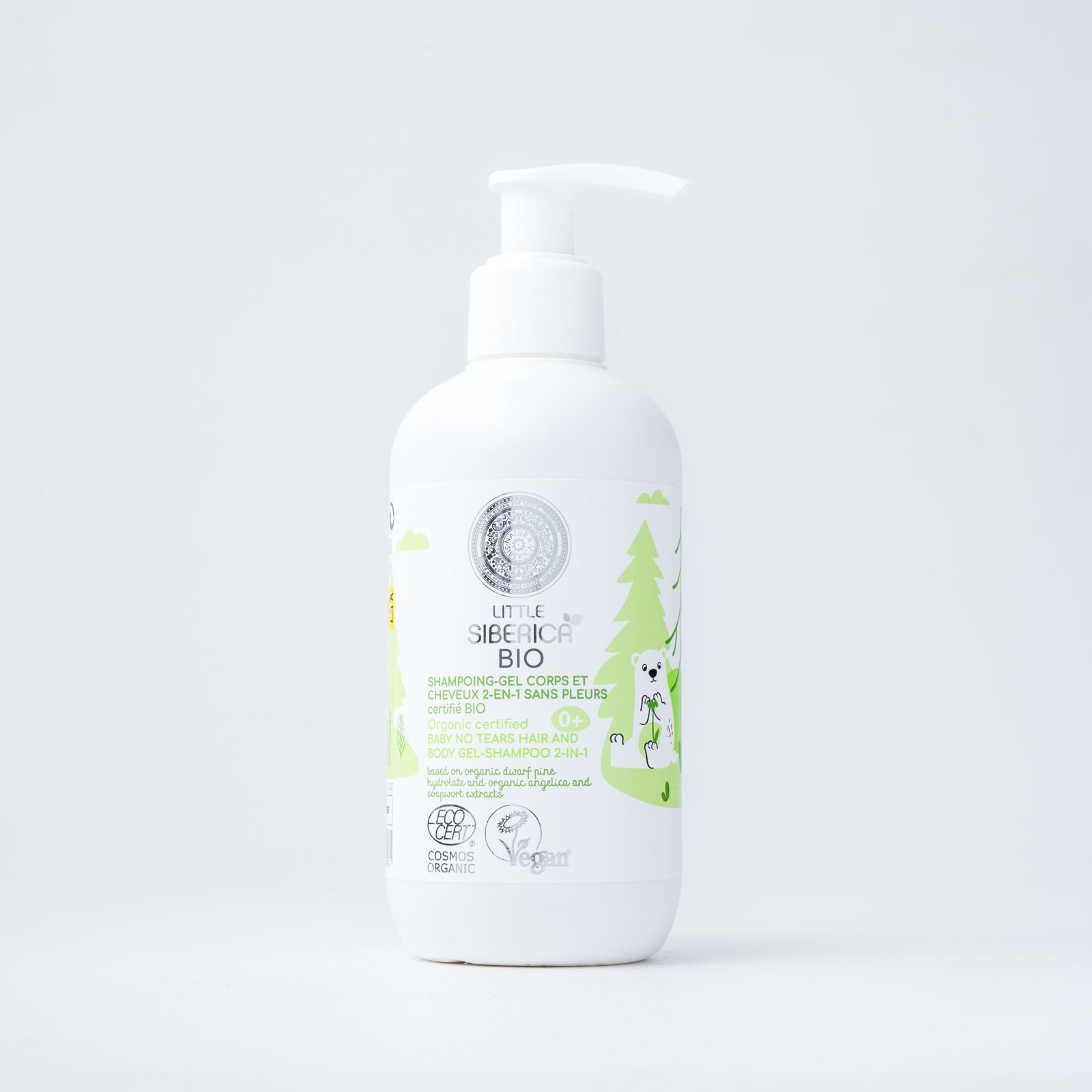 شامبو جل لطيف للأطفال بهيدرولات الصنوبر السيبيري وأنجليكا العضوية، ينظف ويرطب بلطف ويترك البشرة ناعمة ومخملية.