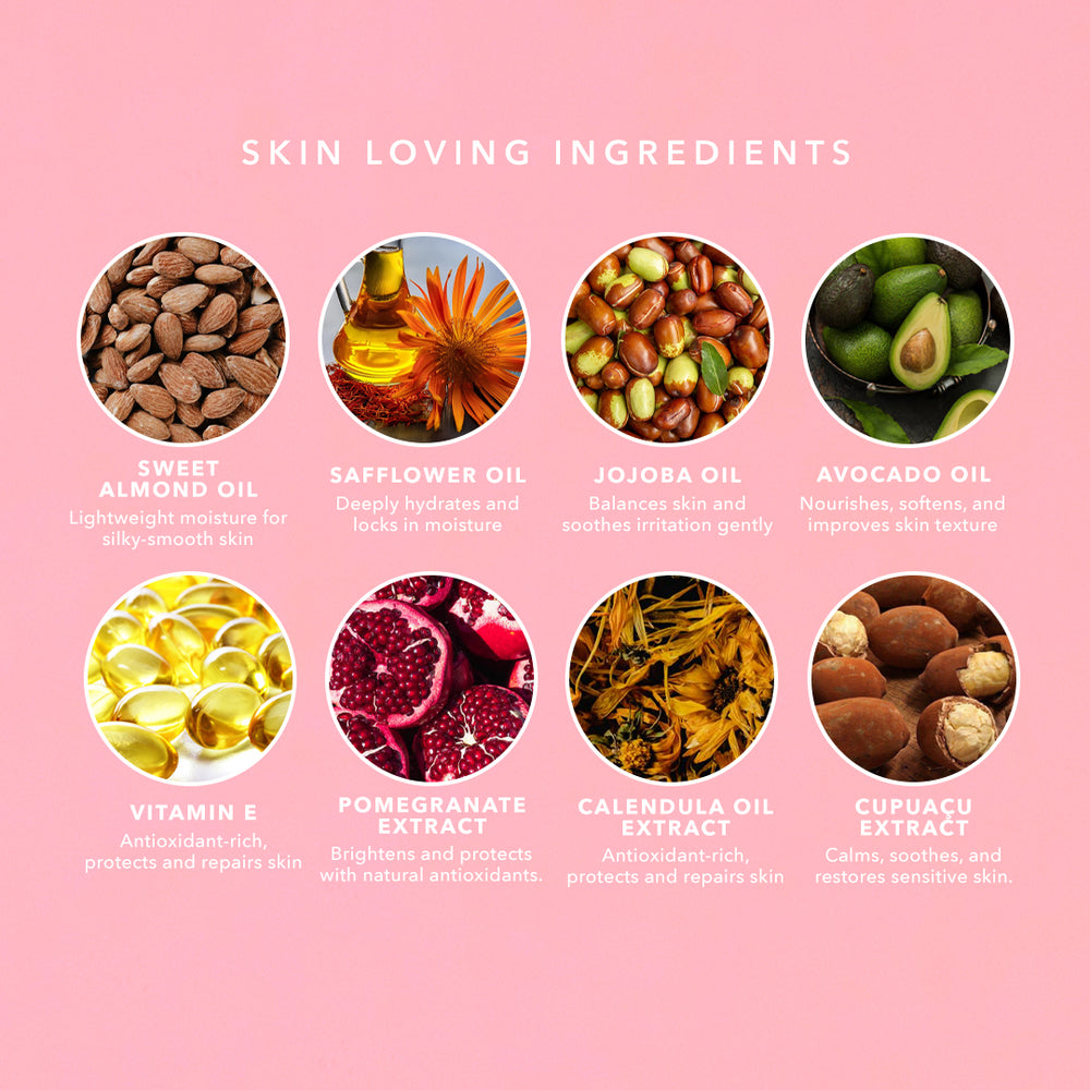 مصنوعٌ من مستخلصاتٍ لطيفةٍ على البشرة، ممزوجةٌ بمزيجٍ غنيٍّ من زيت فيتامين هـ. هذه التركيبة لا