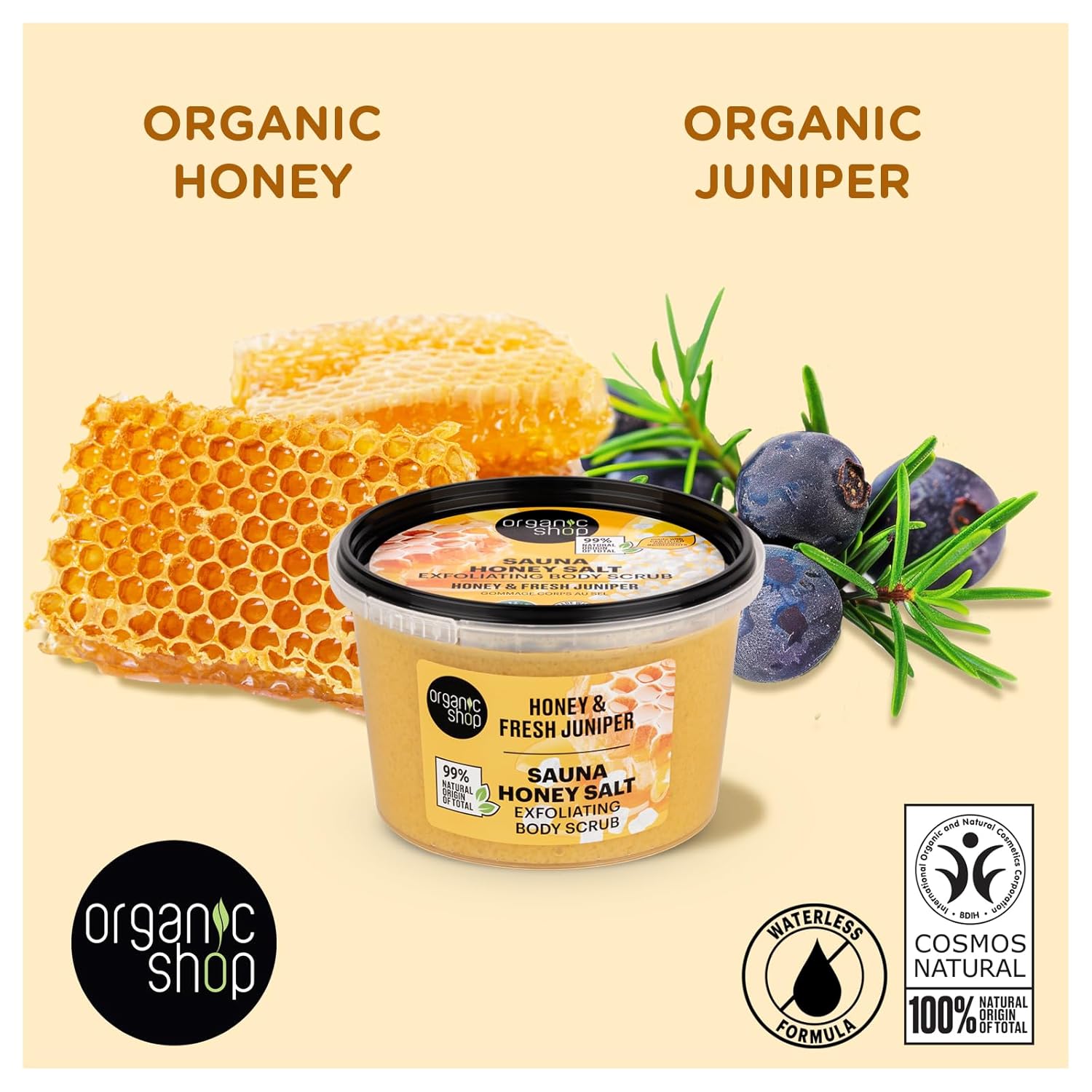 ORGANIC SHOP Honey Salt & Juniper Hydrating & Exfoliating Body Scrub 250ml اوركانك شوب مقشر الجسم المرطب والمقشر بالعسل والملح