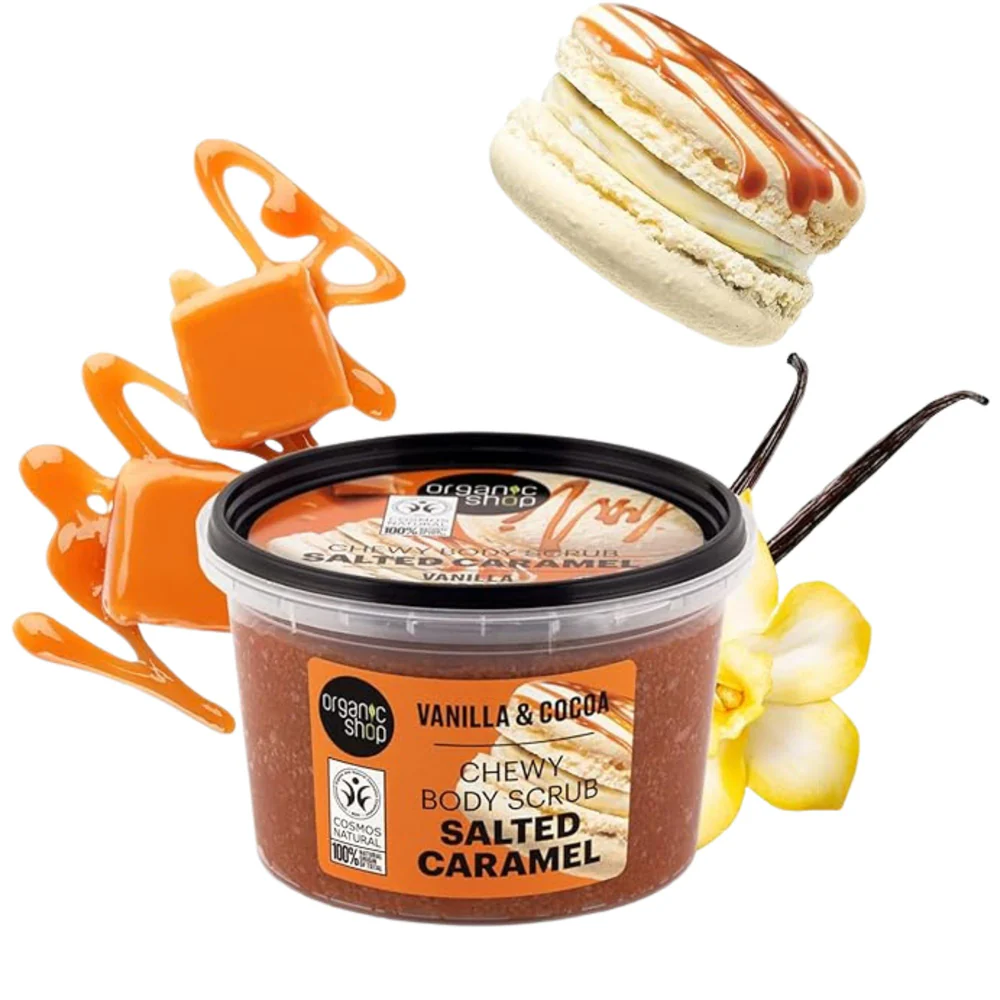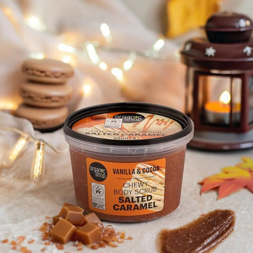 ORGANIC SHOP Salted Caramel Chewy Body Scrub Vanilla and Cocoa 250ml اوركانك شوب مقشر الجسم بالكراميل المملح والفانيليا والكاكاو