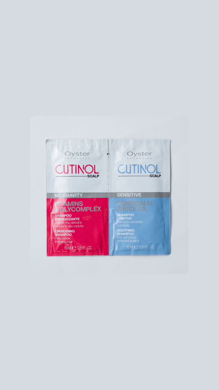 عبوات صغيرة (Sachets) من شامبو العناية بالشعر من Oyster Cosmetics ضمن مجموعة Cutinol Scalpالعبوات تحتوي على نوعين مختلفين من الشامبو، وكل نوع مخصص لهدف معين النوع الاحمر Oyster Cosmetics Cutinol Scalp NO GRAVITY Vitamins Biocomplex Energizing Shampoo (شامبو منشط بخلاصة الفيتامينات يُستخدم كشامبو مُقوّي ومنشط للشعر الضعيف والمائل للتساقط. الهدف منه هو تقليل تساقط الشعر وتعزيز قوته وحيويته النص على العبوة يشير إلى SHAMPOO ENERGIZZANTE – شامبو منشط, coadiuvante e – مساعد و, riducente alla caduta – يقلل من التساقط, FORTIFYING SHAMPOO – شامبو مُقوّي, for weak and thinning hair – للشعر الضعيف والمائل للترقق.)