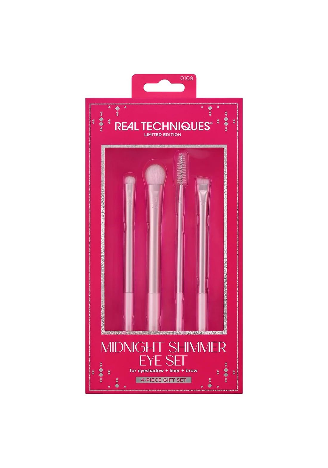تتضمن مجموعة Real Techniques Midnight Shimmer Eye Set 4 فرش مكياج للعيون والحواجب لدمج وتوزيع ميكاب العيون بطريقة احترافية .