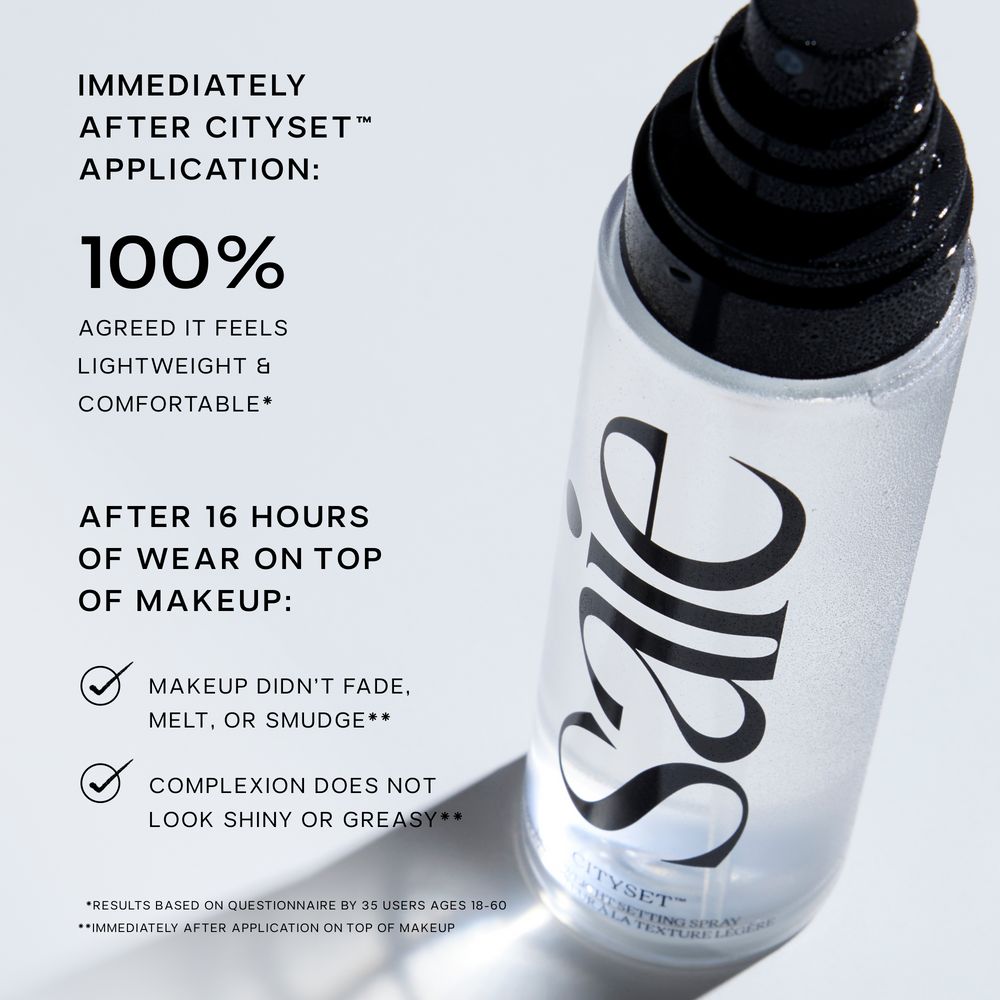 رذاذ تثبيت المكياج CitySet™️ Lightweight Setting Spray من SAIE يعمل على تثبيت المكياج لمدة تصل إلى 16 ساعة مما يمنع بهتانه أو ذوبانه أو تلطخه طوال اليوم يتميز الرذاذ بتركيبة فائقة الدقة يتوزع بالتساوي ويُمتص بسرعة يمنح البشرة مظهراً طبيعياً وندياً دون أن يترك ملمساً لزجاً أو دهنياً العناية بالبشرة تركيبته خالية من الكحول وغير مسببة للرؤوس السوداء كما أنه مرطب ويدعم حاجز البشرة الطبيعي يحتوي على نشا الذرة المتحلل لتثبيت المكياج بمرونة، ومرطبات مثل البروبانيديول والجليكوجين لدعم ترطيب البشرة مناسب لجميع جميع أنواع البشرة بما في ذلك الحساسة والجافة والمعرضة لحب الشباب