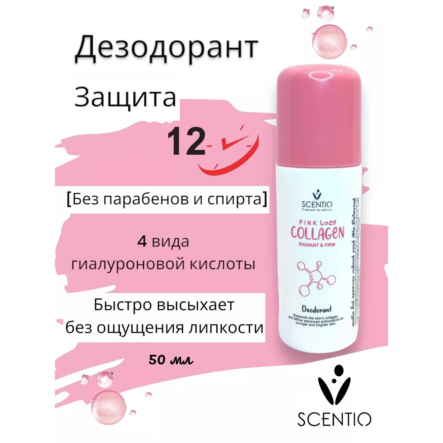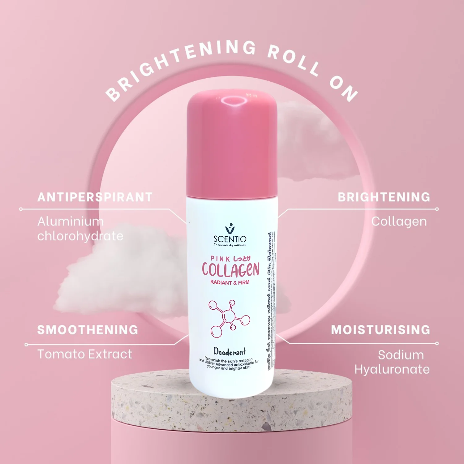 SCENTIO Pink Collagen Radiant & Firm Deodorant Roll On 50ml سينتيو مزيل تعرق بالكولاجين لإشراقة وشد تحت الإبط