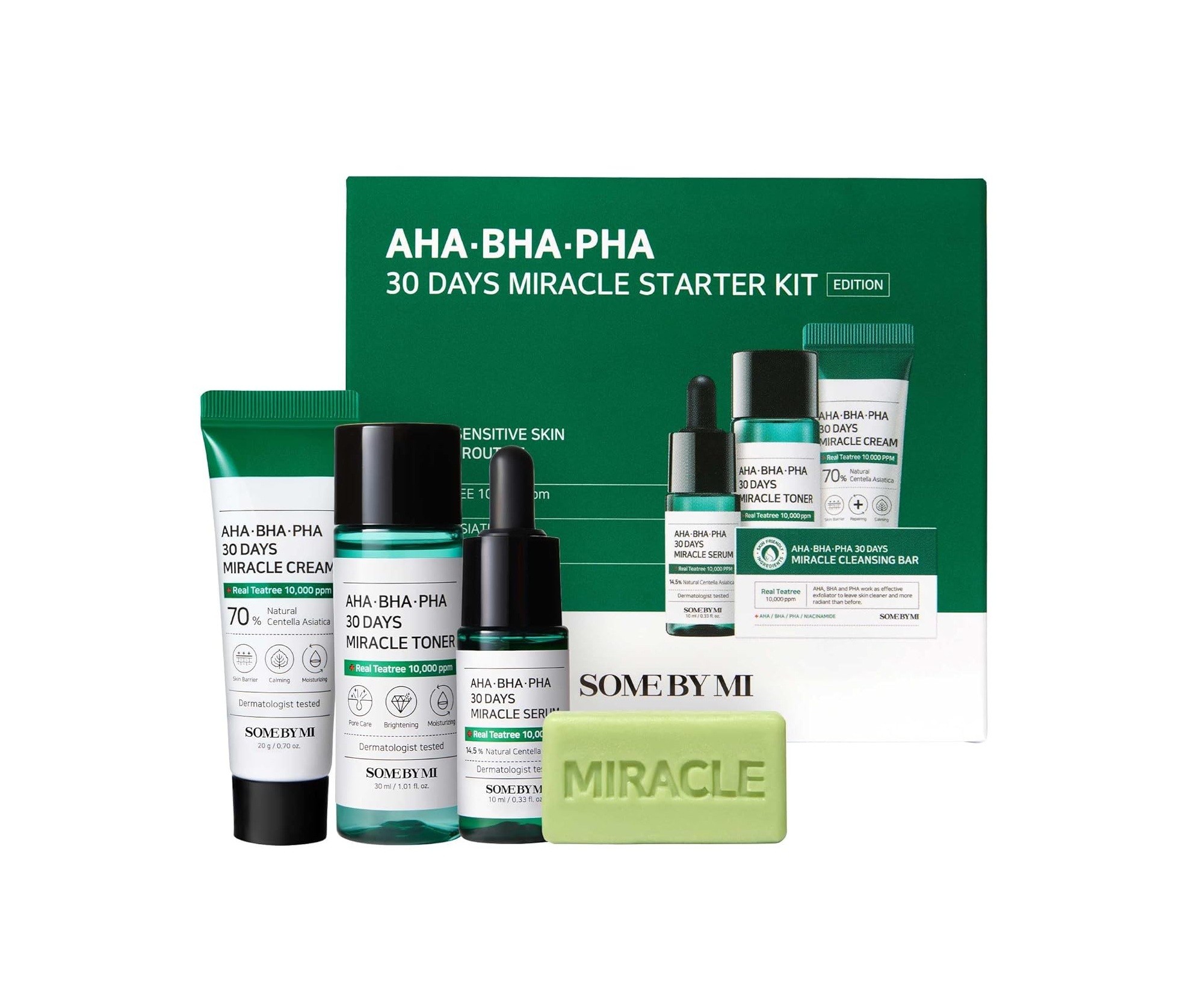 ابدأي رحلتكِ مع مجموعة “AHA BHA PHA 30 Days” من أحماض ألفا هيدروكسي، وبيتا هيدروكسي، وبولي هيدروكسي مع هذه المجموعة الأساسية سهلة الحمل! تحتوي المجموعة على صابونة التنظيف AHA BHA PHA Miracle لتنظيف البشرة بعمق، وتونر AHA BHA PHA Miracle لتقشير لطيف، وسيروم AHA BHA PHA Miracle لتهدئة البشرة المتهيجة، وكريم AHA BHA PHA Miracle لتقوية حاجز البشرة.