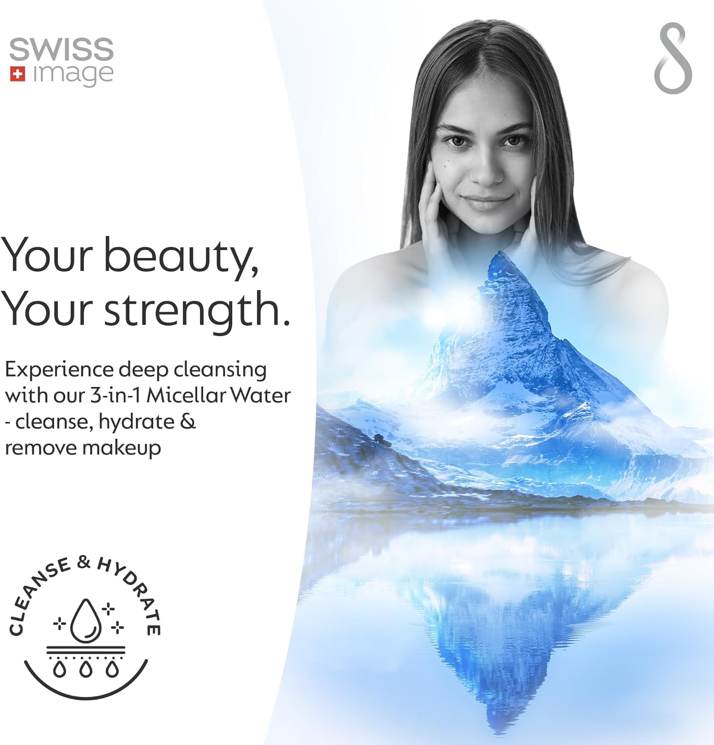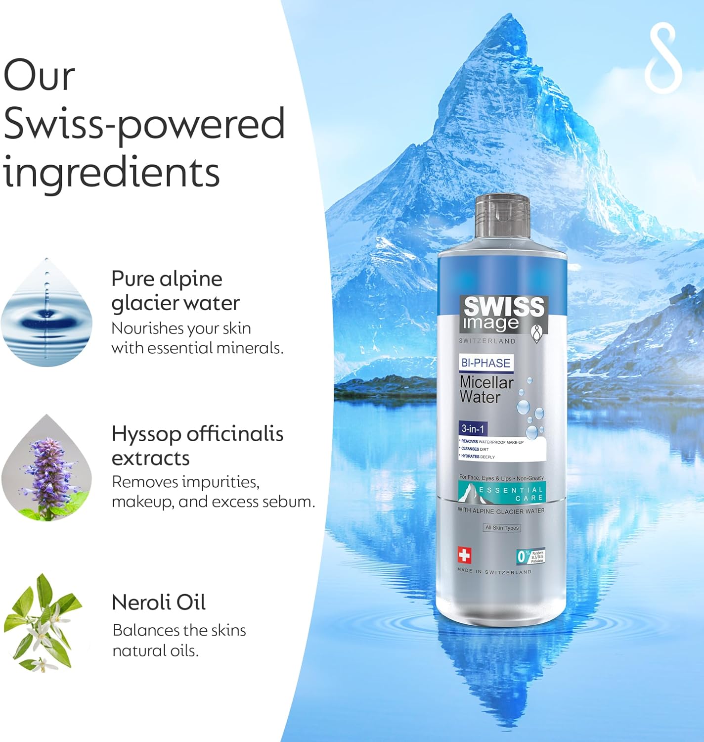 ماء ميسيلار “سويس إيمج” الثلاثي يزيل المكياج المقاوم للماء ويطهر المسام بعمق بفضل مياه جبال الألب.