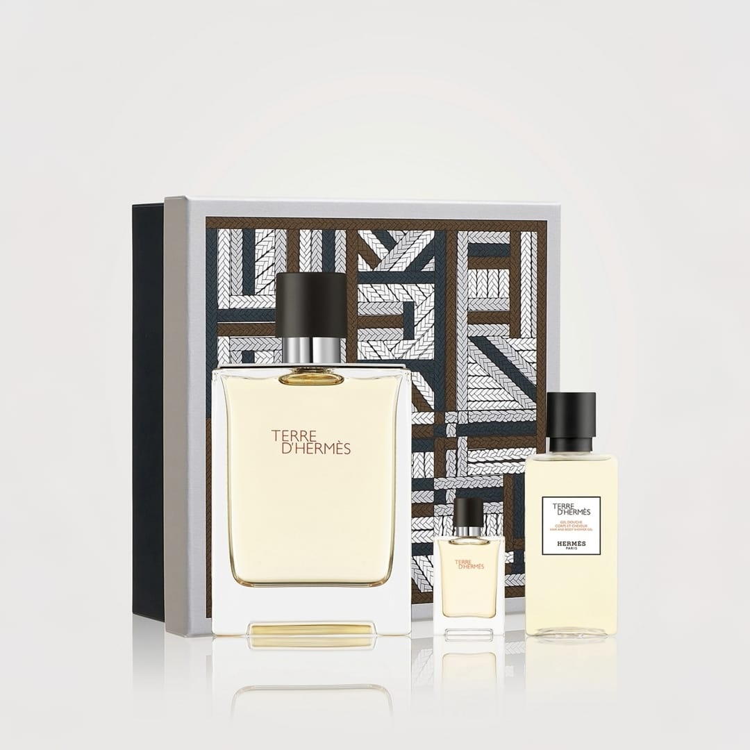 تتميز مجموعات هدايا عطور هيرميس الرجالية بتصميم Tresse H من تصميم جيانباولو باجني. مستوحاة من مواكب الفروسية، تتشابك الضفائر لتشكل حروف كلمة هيرميس. عطر تيري دي هيرميس المعدني الخشبي يجمع بين قوة خشب الأرز وإشراقة الجريب فروت مع لمسة نابضة بالحياة من الصوان. يروي تيري دي هيرميس قصة العلاقة بين الإنسان والأرض، وحواره المتواضع والمتناغم مع العناصر والطبيعة. تيري دي هيرميس هو العطر الذي يربط الإنسان بأصوله، بمصدر قوته الإبداعية.