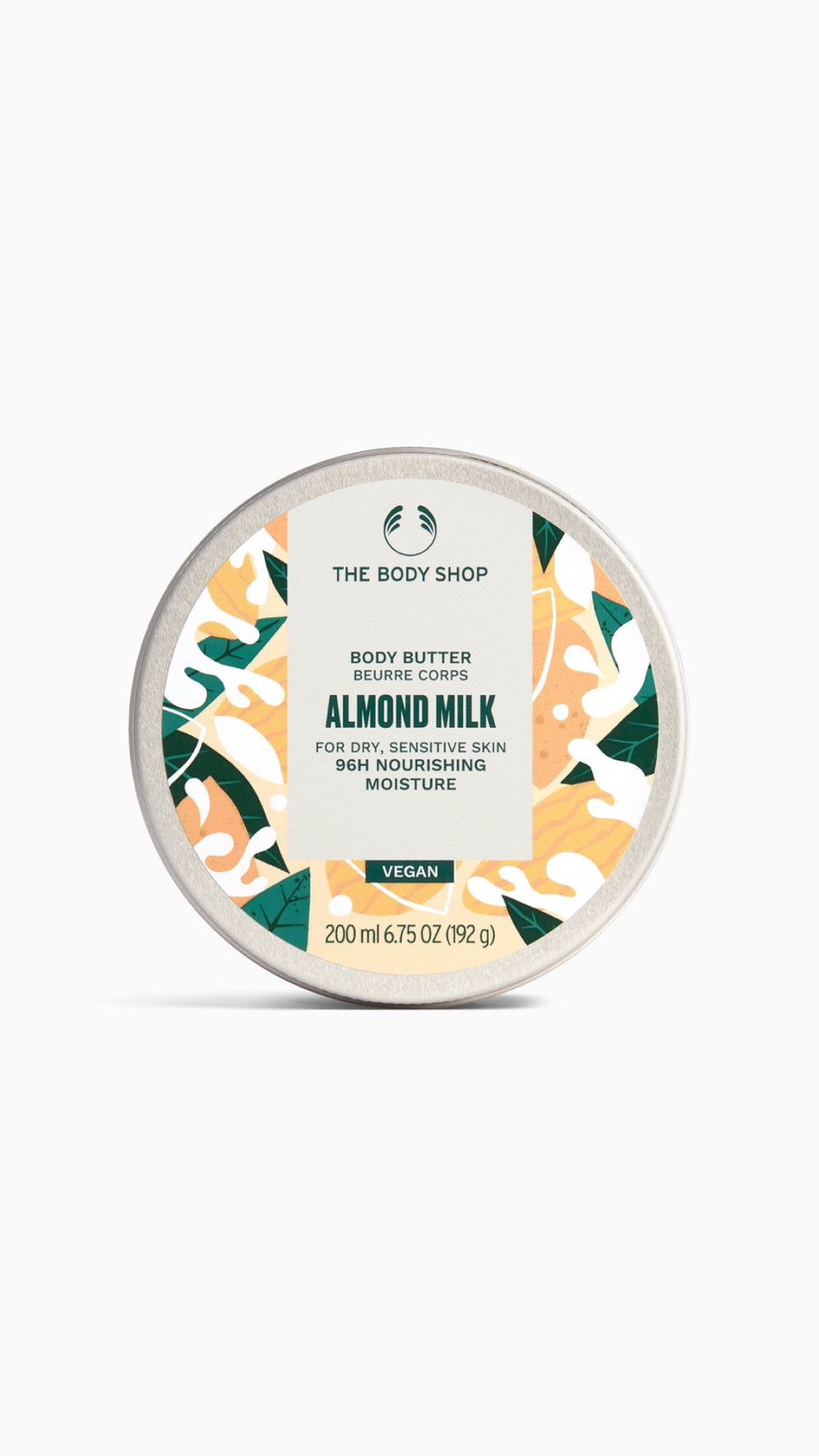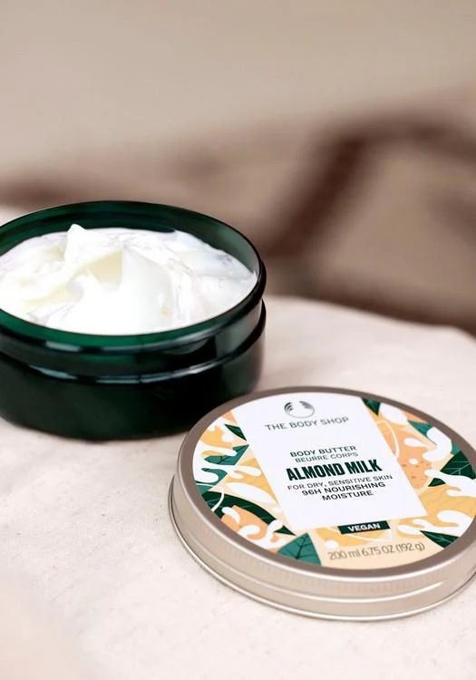زبدة مرطبة للجسم من THE BODY SHOP تعمل بشكل أساسي على منح الجسم ترطيب عميق ومكثف بالاضافة الى تغذية البشرة وتهدئتها ومنحها رائحة منعشة بفضل تركيبتها الغنية بمكونات طبيعية مثل حليب وزيت اللوز.