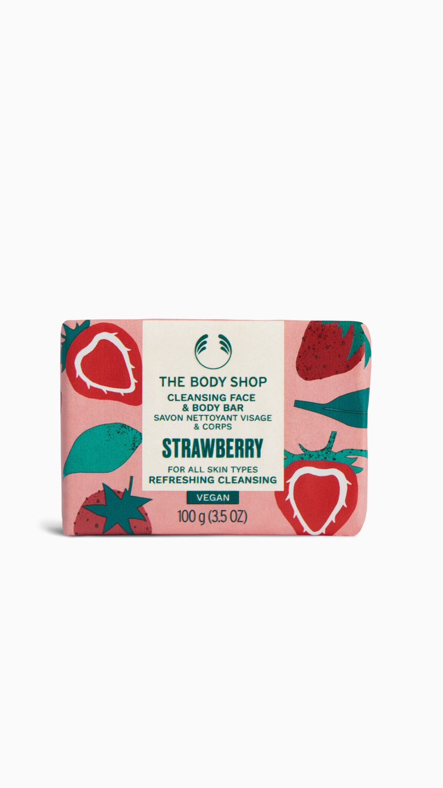 صابونة منظفه للوجه والجسم من THE BODY SHOP تعمل بشكل اساسي على ازالة الاوساخ والشوائب وتمتاز بتركيبة غنية برائحة الفراولة المنعشة.