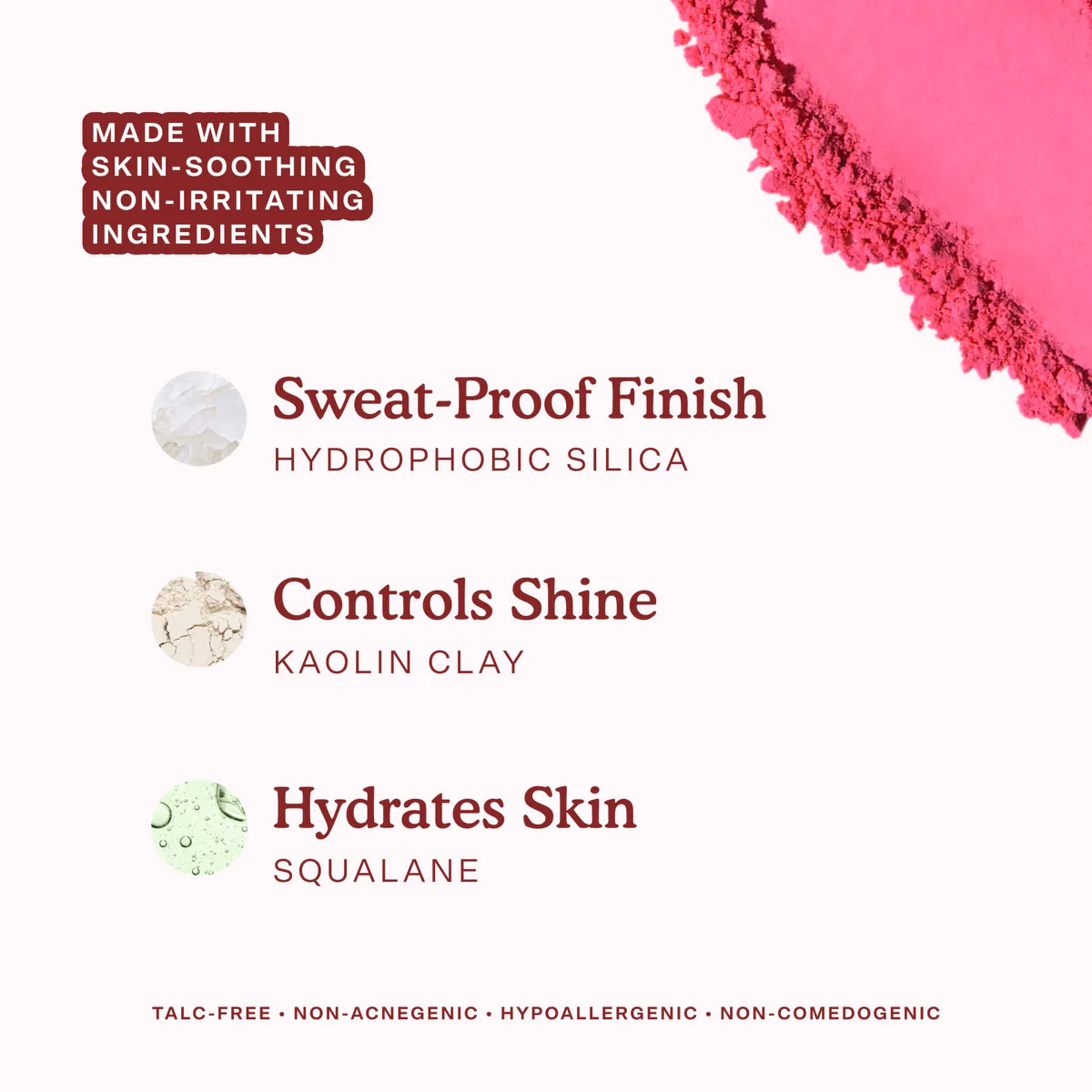 بلاشر مبتكر يجمع بين لون غني وثبات عالي مع تأثير تمويه يشبه البودرة المثبّتة. يمنح الخدود لونًا واضحًا يدوم طوال اليوم، وفي نفس الوقت يساعد على تقليل مظهر المسام وتنعيم ملمس البشرة. تركيبته خالية من التالك وتوفر لمسة مطفية ناعمة بدون أي لمعة أو شيمر، مما يجعله مثاليًا لإطلالة طبيعية ومخملية.