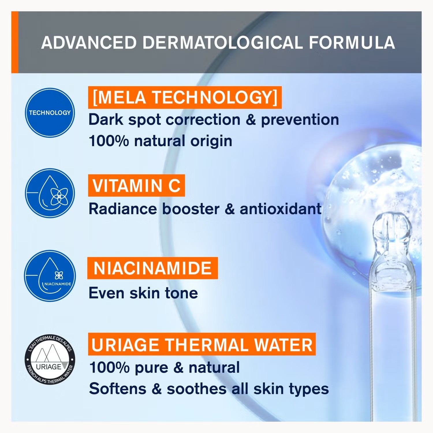 تركيبة غنية بتقنية ميلا™ وفيتامين سي والنياسيناميد، تُساعد على توحيد لون البشرة غير المتجانس بشكل ملحوظ، وتتركها منتعشة ومشرقة. مُعززة بمياه حرارية من يورياج، صُممت هذه التركيبة خصيصًا لجميع أنواع البشرة، بما في ذلك البشرة الحساسة.
