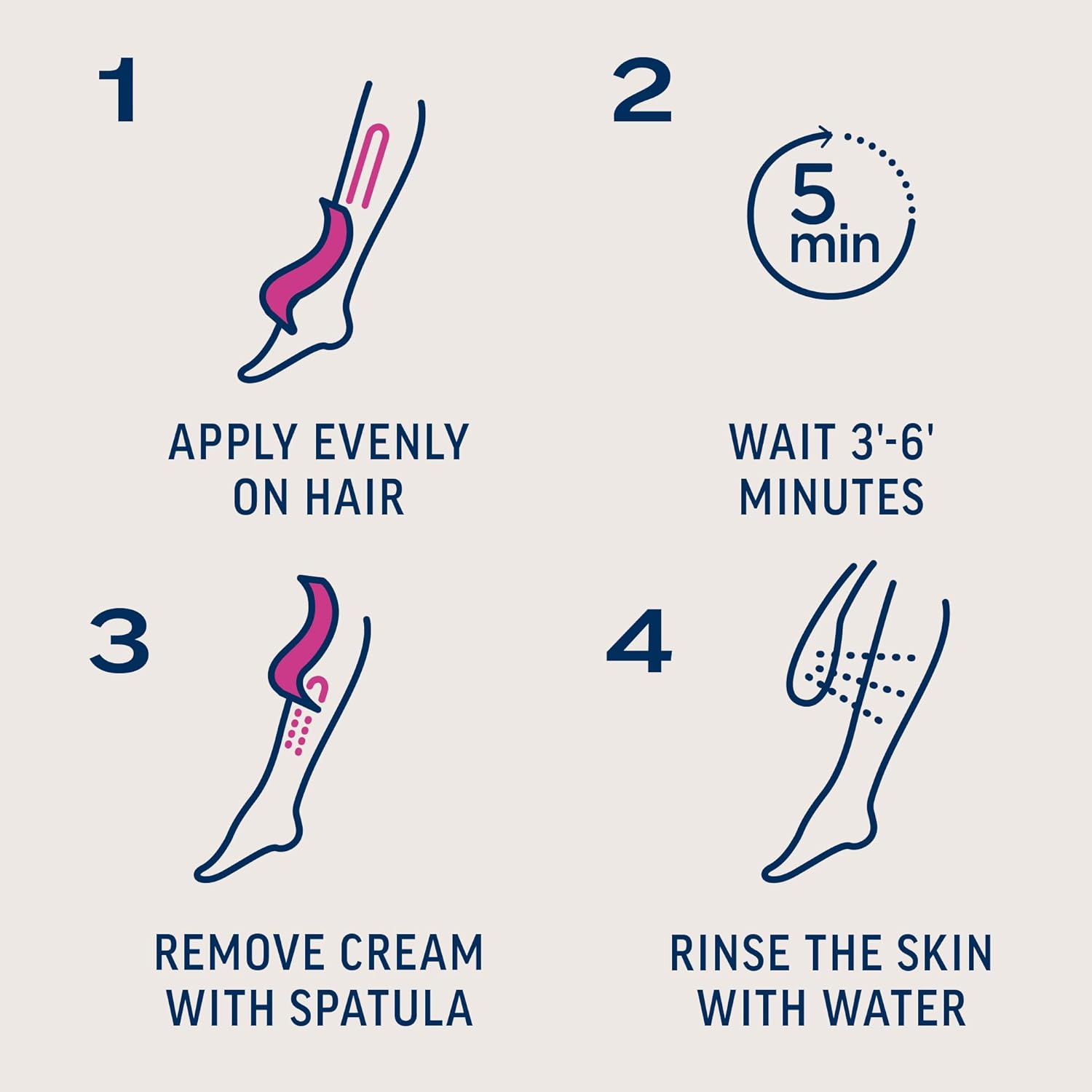 ضعي طبقة رقيقة من الكريم على المنطقة المطلوبة. اتركيه لبضع دقائق حتى يبدأ الشعر بالانفصال. أزيليه باستخدام ملعقة. يُستخدم على الساقين والذراعين والإبطين ومنطقة البكيني. تجنبي ملامسة الكريم للعينين والأغشية المخاطية. اشطفيه جيداً بعد الاستخدام.